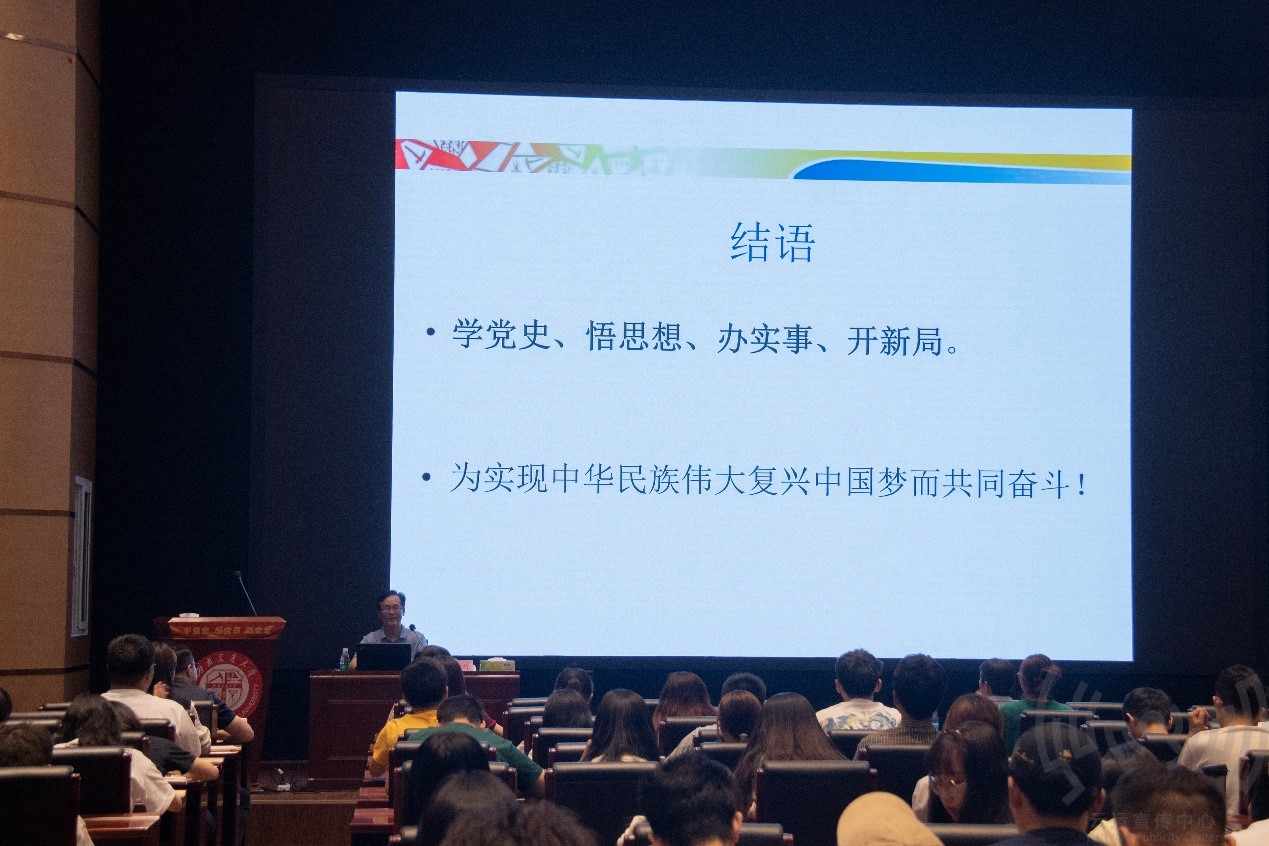 在讲座中,刘教授用朴实的语言、丰富的案例、翔实的数据,按建党伟业、救国大业、兴国大业、富国大业、强国大业为节点,深入阐释了中国共产党的百年辉煌;从牢记初心使命、坚定信仰信念、勇于自我革命等解析了中国共产党百年历史的“红色密码”。 勉励师生学好党史,在党言党,在党爱党,在党护党,为中华民族伟大复兴的中国梦而共同奋斗!