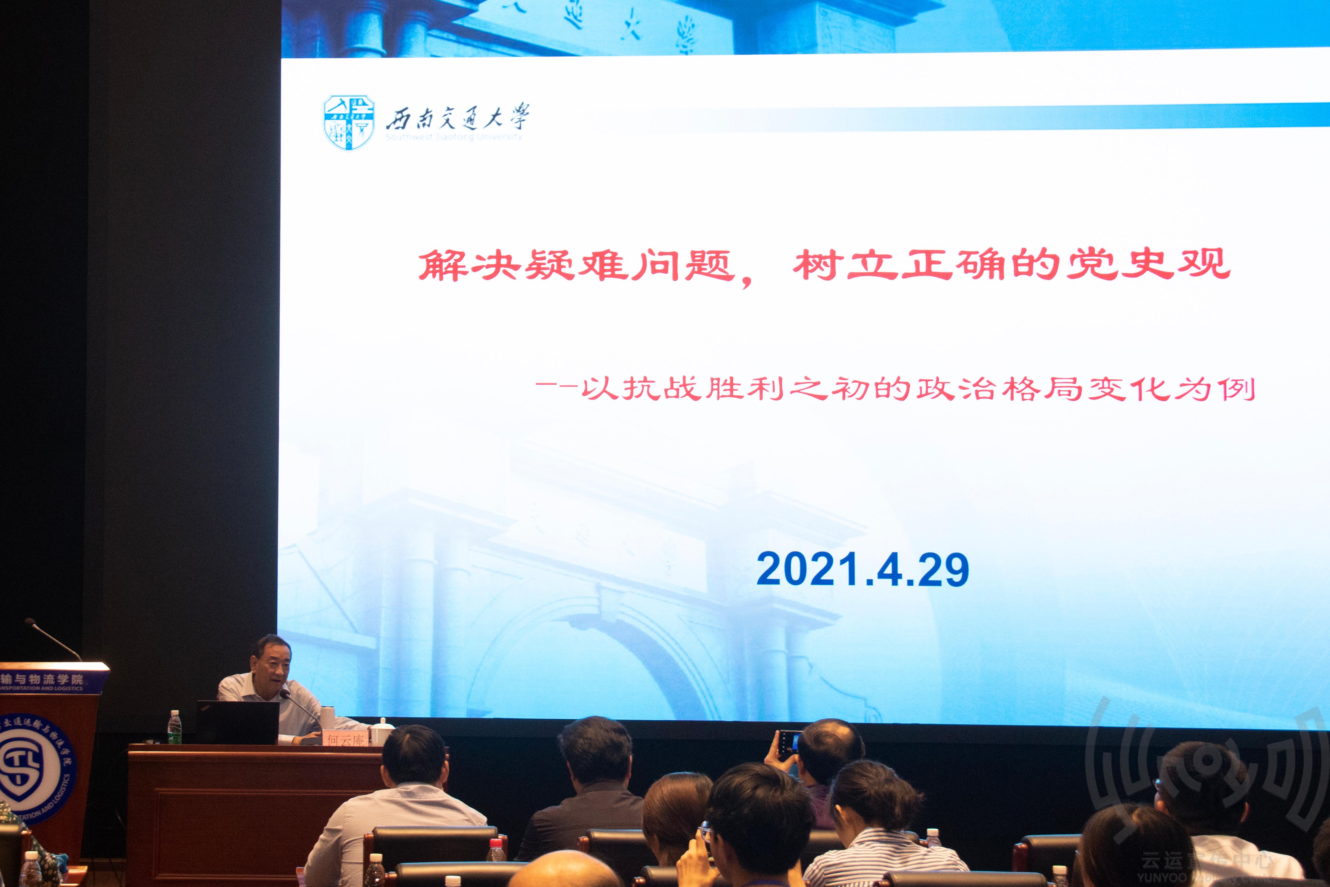 2021年4月29日下午,交通运输与物流公司党委与电气工程公司党委在交运楼联合举办“学党史,铭初心”党史学习教育专家辅导报告会,邀请公司马克思主义公司教授、四川省委宣讲团成员何云庵同志作“解决疑难问题,树立正确党史观”的专题报告。两个公司党员领导干部、党支部书记及部分师生党员共200余人参加了报告会。报告会由交通运输与物流公司党委书记甘灵主持。