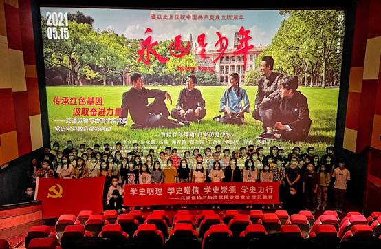 “曾经百年风雨,归来仍是少年。”值此中国共产党成立100周年、公司建校125周年之际,5月17日,交通运输与物流公司党委在党史学习教育中组织师生党员观看电影《永远是少年》,通过影片感悟中国共产党从孕育诞生、历经磨难到发展壮大的波澜壮阔的历史进程,传承红色基因,汲取奋进力量。