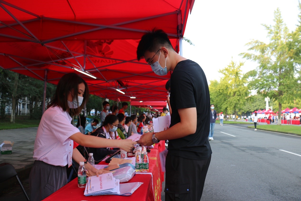 在室外的迎新点里,志愿者们从新生报到身份信息确认、相关资料的填写,到校园卡和宿舍钥匙的领取,都一一协助新生办理完成。一站式服务极大地简化了新生报到手续办理的流程。