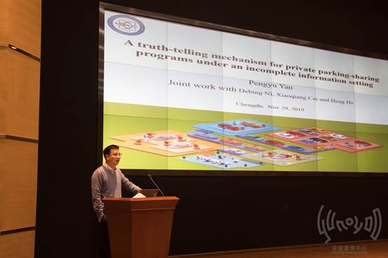 电子科技大学晏鹏宇教授则介绍关于《A truth-telling mechanism for private parking-sharing programs under an incomplete information setting》。的内容。在报告的开始,晏鹏宇教授提出了我国目前的一个普遍现象,车位需求量远大于现有的车位数量,而私家车位的利用率低。针对这一现象,晏鹏宇导师详细介绍了自己团队设计的一个可以实时观察及匹配空余车位的智能系统。