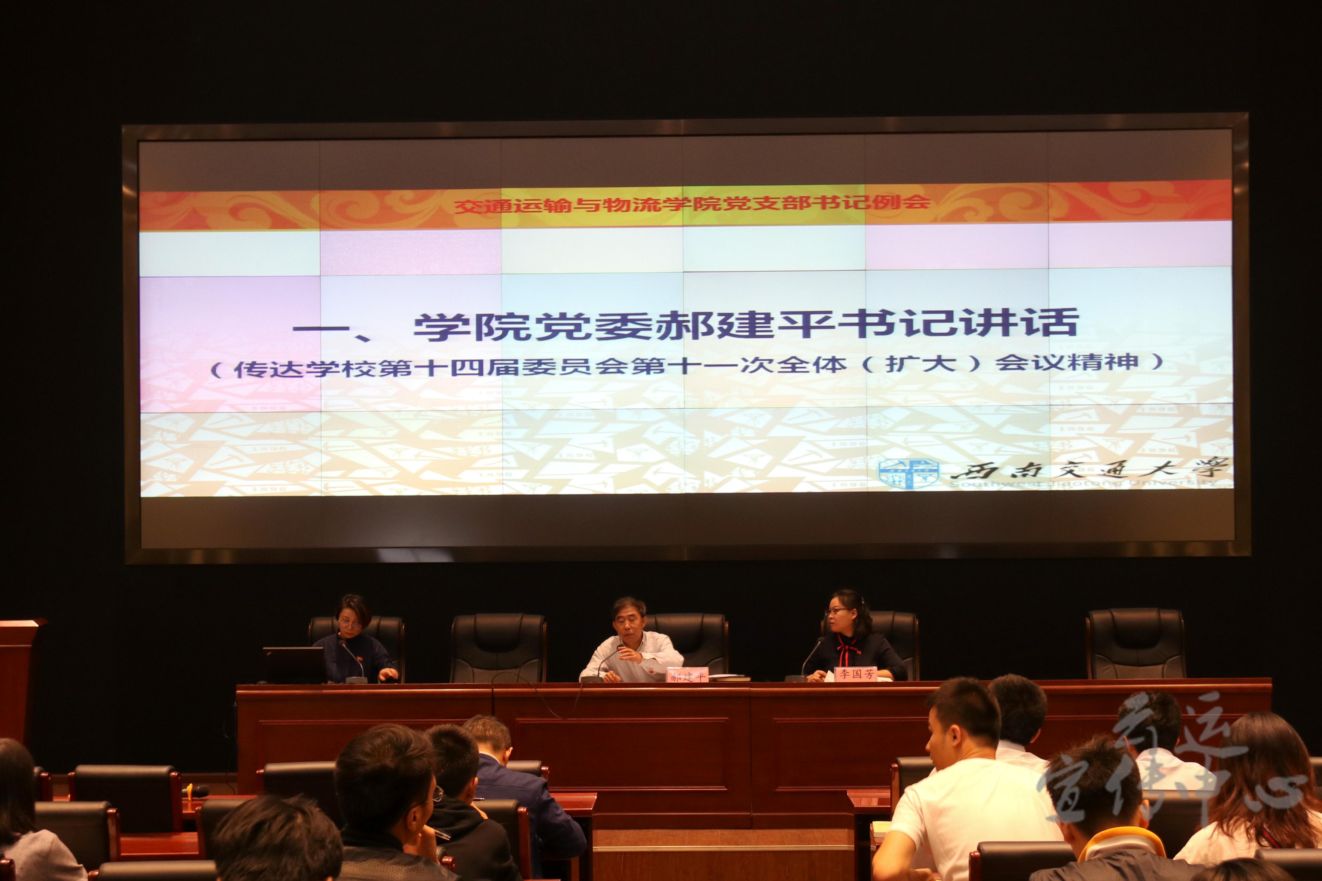 2018年9月13日下午4:00,交通运输与物流公司党委在犀浦校区交运楼417会议室召开党支部书记例会,重点学习了公司第十四届委员会第十一次全体(扩大)会议精神,并对“两学一做”学习教育常态化制度化督导要求再一次进行了详细的部署。公司党委郝建平书记、党委李国芳副书记、党务秘书黄莺老师及全院教工、员工党支部书记出席了本次会议,会议由黄莺老师主持。
