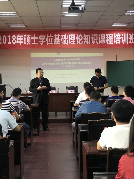 2018年9月22日上午2018年硕士学位基础理论知识课程培训班开班典礼在九里校区0号楼01213举行,交通运输与物流公司党委郝建平书记、经理助理蹇明教授、培训部燕鹏飞主任和28名学员参加了开班典礼。