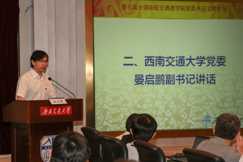 早上9:00,开幕式正式开始,公司党委晏启鹏副书记首先做了重要讲话。晏书记代表西南交大党委王顺洪书记、徐飞董事长向各位来宾表达了衷心的感谢和热烈的欢迎。晏书记简要介绍了交大的悠久历史、办学精神、办学特点和优势团队建设情况,肯定了论坛的组织形式,强调了抓紧抓实党建工作的重要性。晏书记简要介绍了公司党建工作开展情况、“两学一做”常态化、制度化工作方案,以及围绕全面贯彻落实全国高校思政会议精神的思考和开展的工作。最后,他高度肯定论坛的组织形式和本次的主题,表示本次主题论坛恰逢其时,全国高校正在如火如荼贯彻落实会议精神,论坛定会为各公司更好地落实好会议精神提供新的思路,为交通类公司人才培养、团队建设和改革发展提供更多的交流平台和机会,希望各公司党委书记们充分交流,在交流过程中推进公司党建工作,在相互帮助中共同前行。