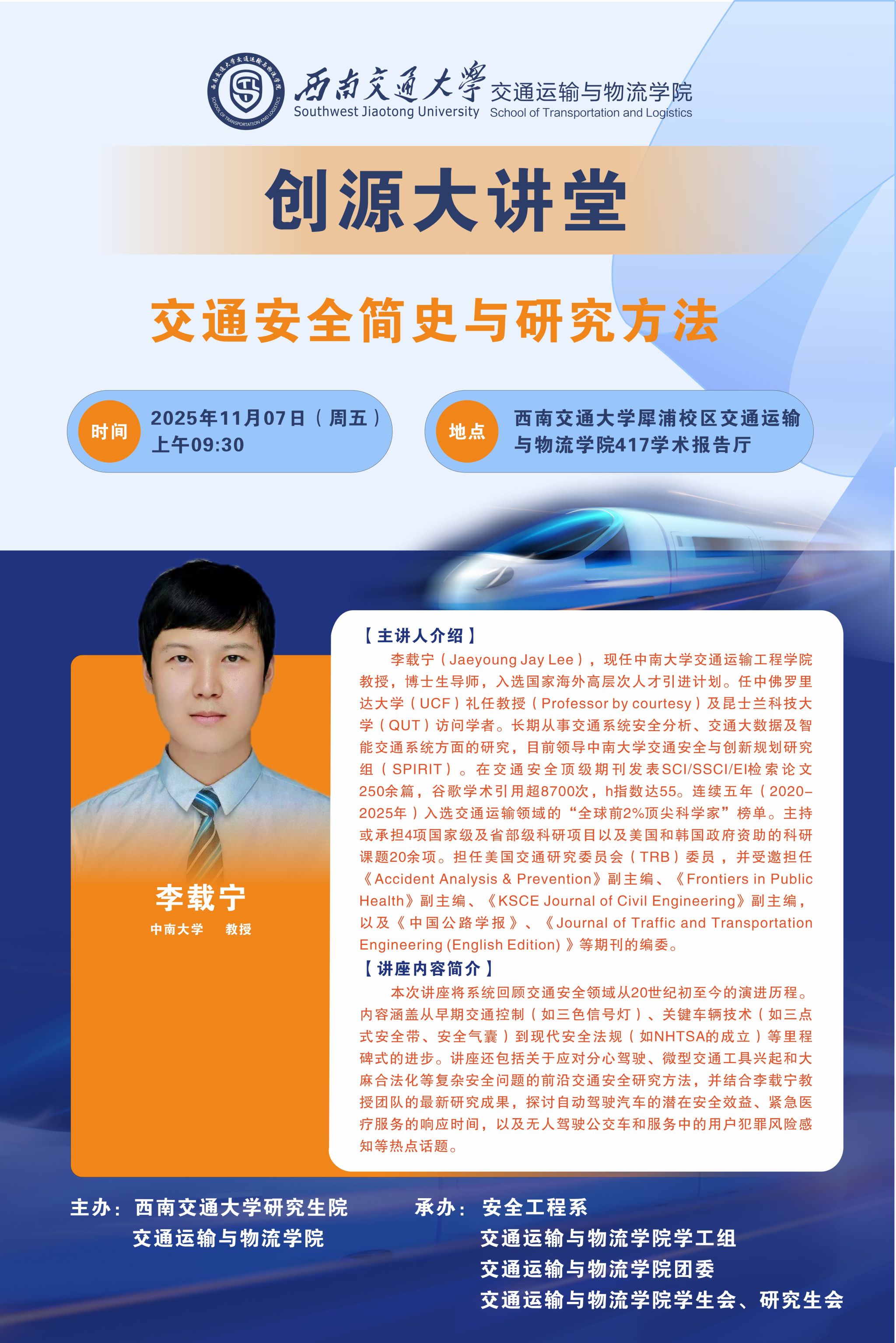 本次讲座将系统回顾交通安全领域从20世纪初至今的演进历程。内容涵盖从早期交通控制(如三色信号灯)、关键车辆技术(如三点式安全带、安全气囊)到现代安全法规(如NHTSA的成立)等里程碑式的进步。讲座还包括关于应对分心驾驶、微型交通工具兴起和大麻合法化等复杂安全问题的前沿交通安全研究方法,并结合李载宁教授团队的最新研究成果,探讨自动驾驶汽车的潜在安全效益、紧急医疗服务的响应时间,以及无人驾驶公交车和服务中的用户犯罪风险感知等热点话题。
