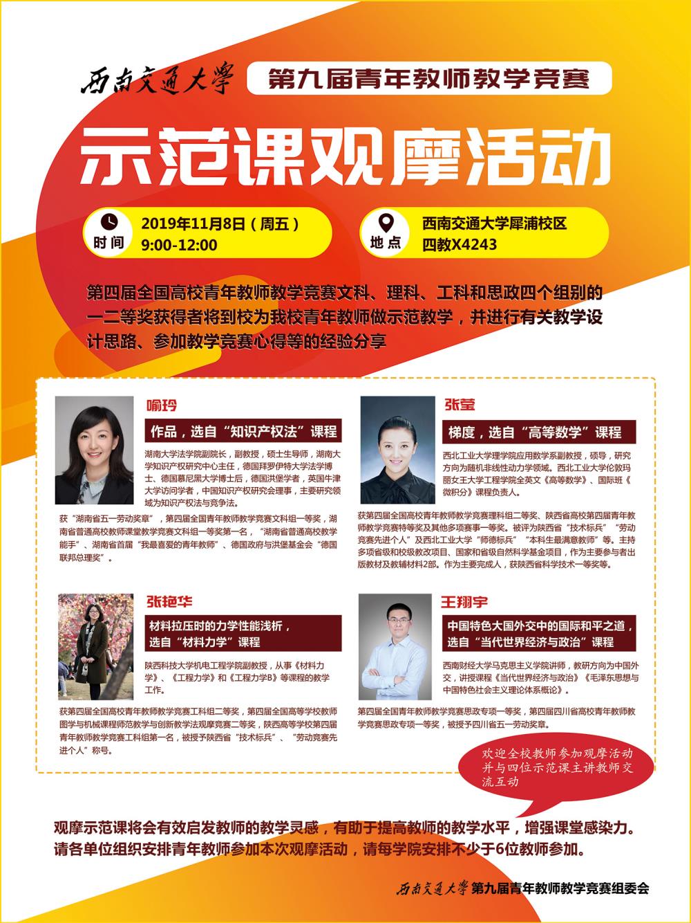 欢迎全校教师参加观摩活动并与四位示范课主讲教师交流互动。