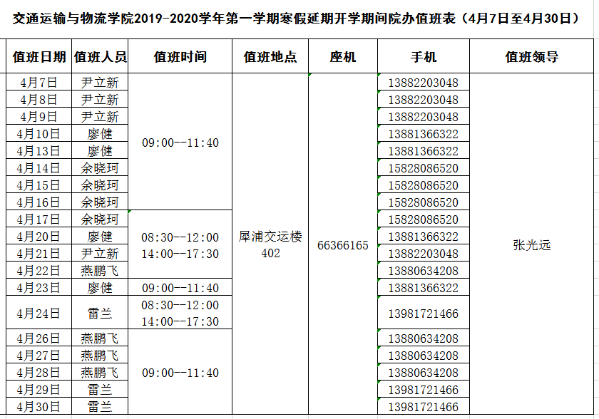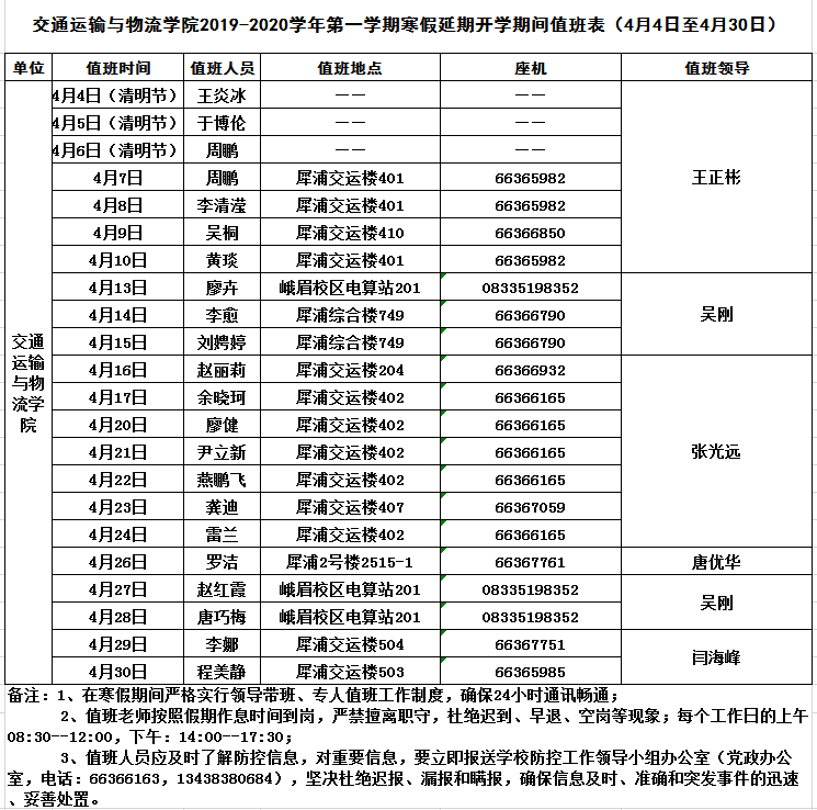 伟德体育2019-2020学年第一学期寒假延期开学期间值班表(4月4日-4月30日)