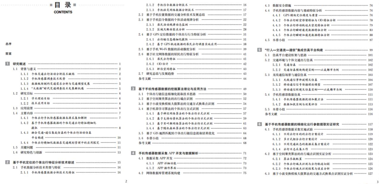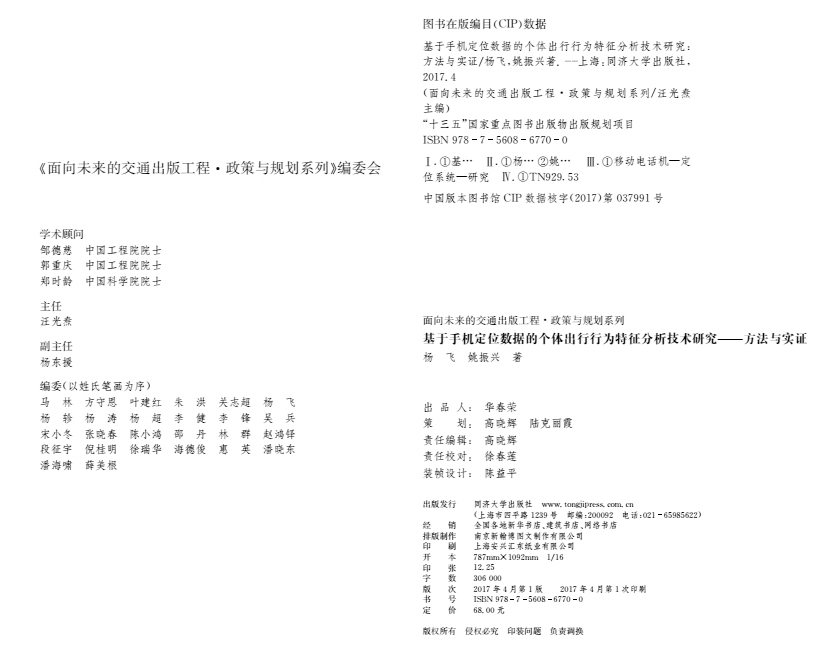 本次出版专著成果主要依托杨飞教授主持的2项国家自然科学基金面上项目开展研究,即“基于手机APP传感器数据的个体出行特征精细化提取与交通模型优化(项目编号:51678505)”、“融合多源移动定位时空数据的居民出行调查与活动行为分析技术研究(项目编号:51178403)”,主持的教育部新世纪优秀人才支持计划项目“基于新一代移动通信事件和定位技术的城市交通管理决策支持研究(项目编号:NCET-13-0977)”、Bevictor伟德高层次人才计划项目“竢实之星”以及系列结合政府管理部门和交通行业发展实践需求的工程横向应用实践科研课题进行研究成果凝练,充分重视理论与实践的融合,有助于为科研学术成果向交通行业实践应用转化做好准备。
