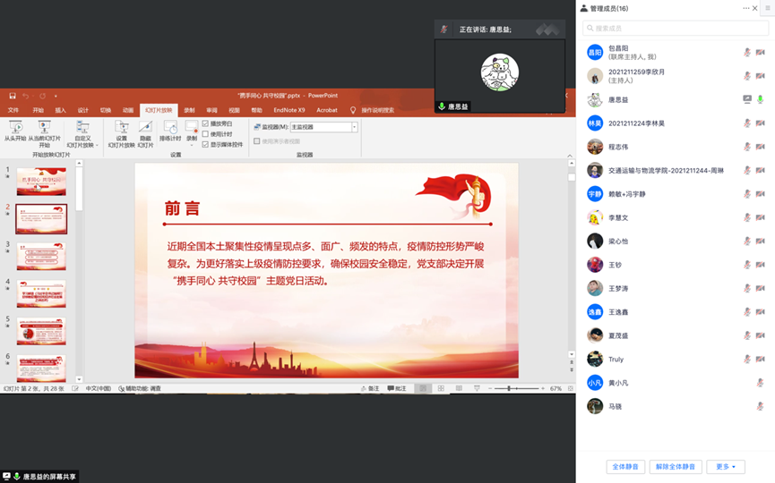 通过学习,党员同志们深刻认识到当前国内外疫情防控的复杂性、艰巨性、反复性,更加明确党员同志更要以身作则,始终坚持人民至上、生命至上,全面落实疫情防控的各项要求。师生党员纷纷表示,要坚决服从公司疫情防控工作安排,坚决听从指挥,严格落实“非必要、不离校”的要求,从我做起,从小事做起,自觉配合公司疫情防控工作的开展。