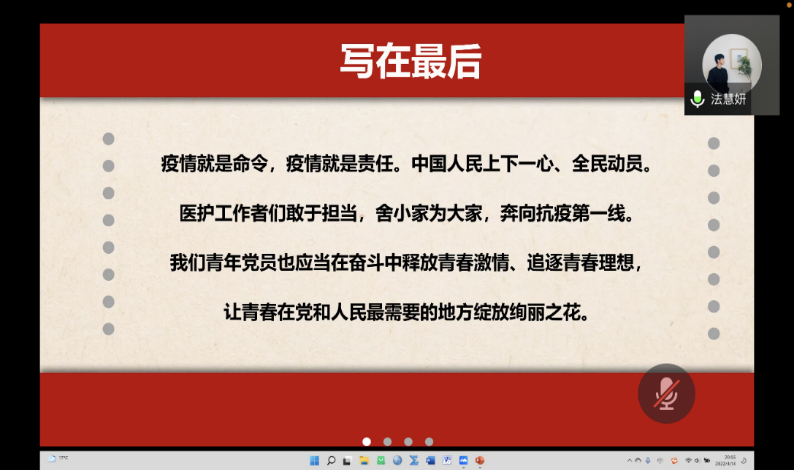 硕士21级第四党支部书记包昌阳同志为支部为党员同志分享了2020年她在湖北地区的抗疫生活。她所在的荆州市就在武汉旁边,自从疫情爆发后便封城多日,无论是病人还是在前线的工作人员,都让人牵挂不已。在那次疫情中,包昌阳同学与其家人决定做一些自己力所能及的事情,为医护人员送上一些慰问物资,为他们加油鼓劲,守望相助,共度难关。