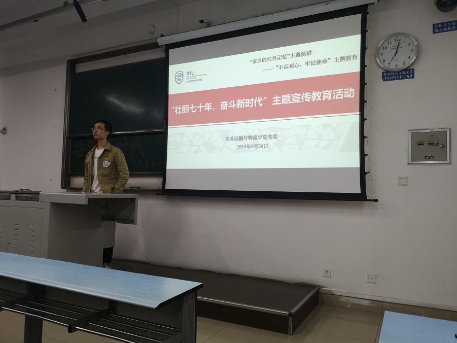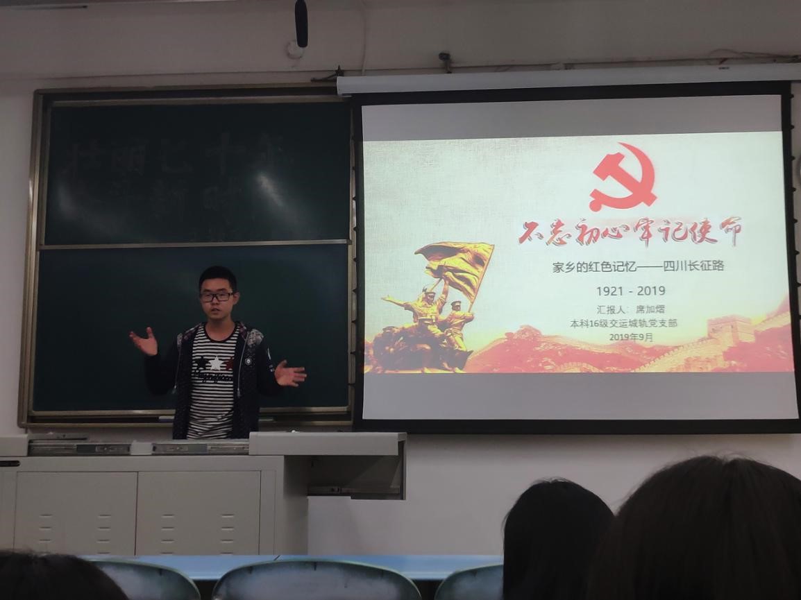 2019年9月26日晚19:00,伟德体育本科九个党支部于犀浦校区X2220联合开展“壮丽七十年,奋斗新时代”主题宣传教育活动。各个支部的代表以“家乡的红色记忆”为主题进行演讲,通过介绍自己家乡红色精神以及70年来的发展变化,让在座的每一个党员都感受到了自己的初心使命、见证了祖国70年来的伟大变迁。本次活动由本科交运第一党支部李冠辉同志主持。