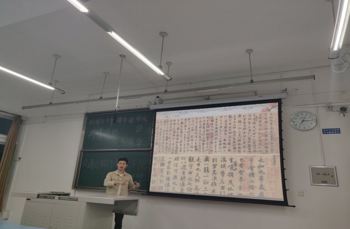 第三部分:介绍中华传统文化瑰宝——书法艺术。由原书画协会会长梁越同学向大家普及书法知识。梁越同学从颜真卿颜体入手,阐述了不同时期的颜体变化所彰显的心境、眼界的变化,然后依次讲解了小篆、行书、草书等不同字体的风格与写法,从握笔到印章全方面的进行了普及,让我们广大党员了解了书法这一国粹的魅力,对中华文化有了更深一步的认识。