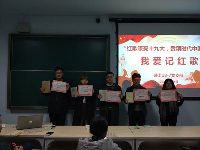 为践行社会主义核心价值观,弘扬爱国主义精神,2018年11月29日硕士18级第七党支部在X9238教室开展了“我爱记红歌”活动。本次活动由党支部书记陈木泉同志主持。