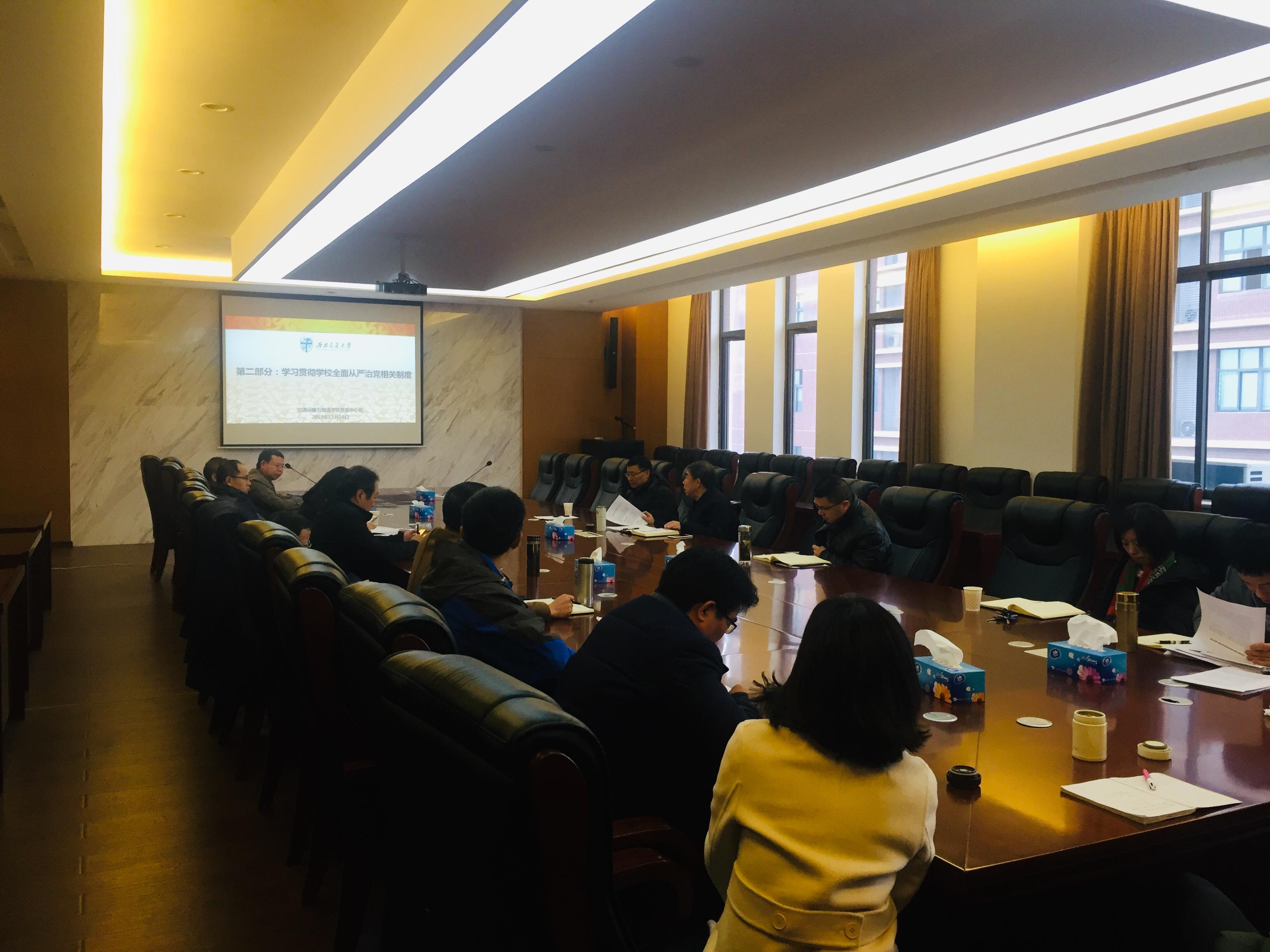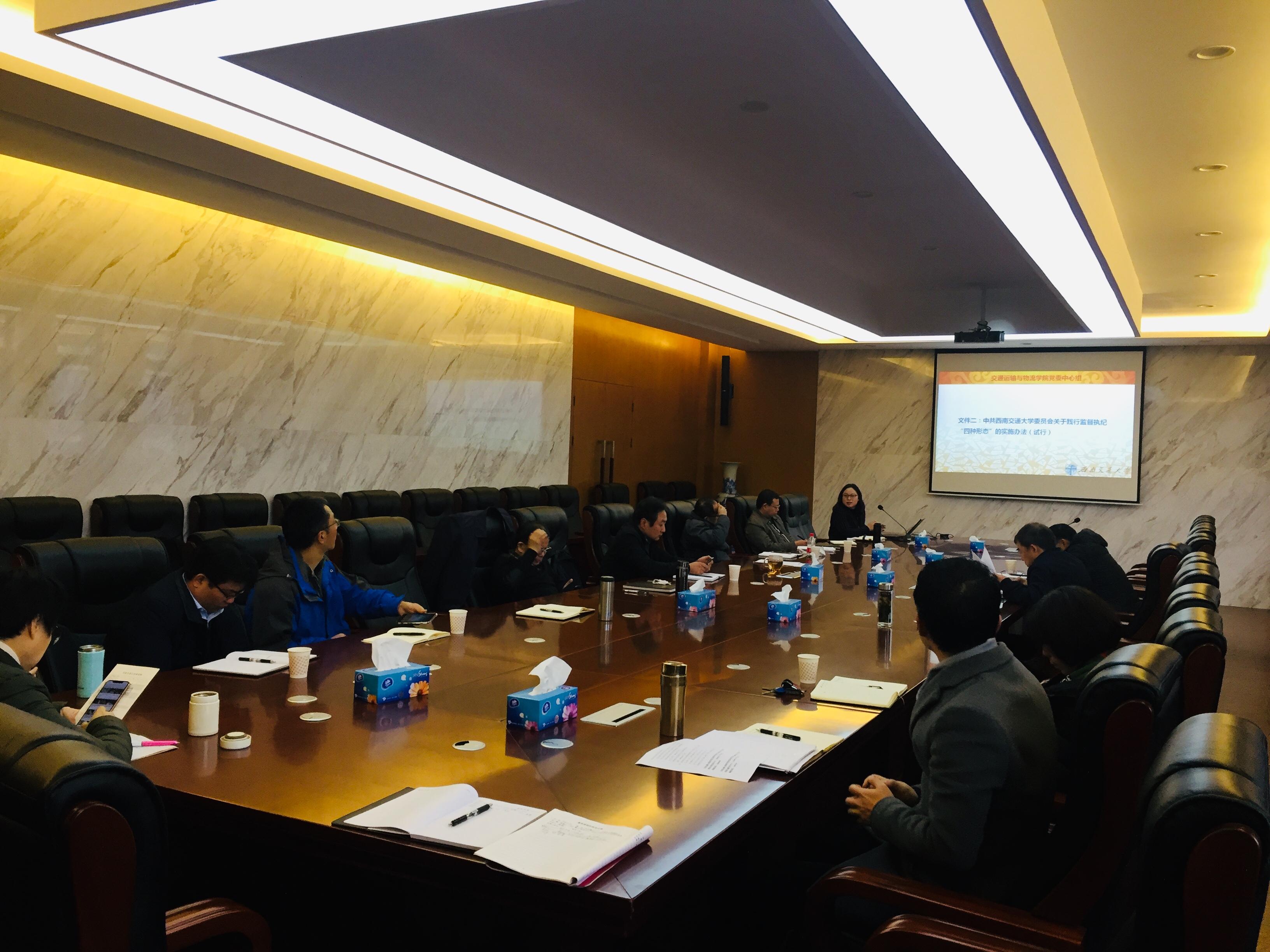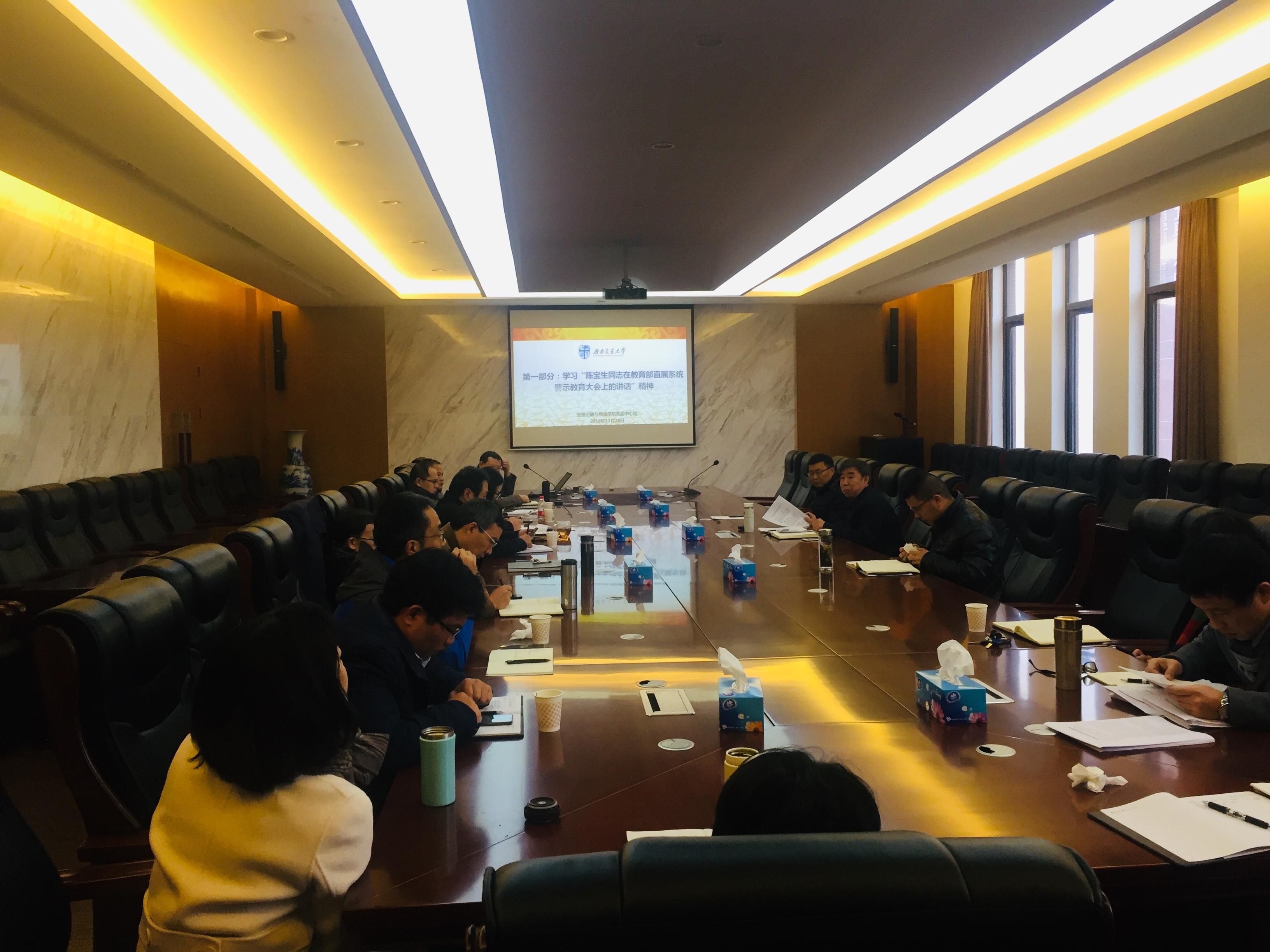 交通运输与物流公司党委于2018年11月28日上午9:00在犀浦校区交运楼417会议室召开党党委中心组学习(扩大会),出席会议的有公司中心组成员、党委委员和纪委委员,会议由党委郝建平书记主持。学习包括两个专题,第一个专题由公司党委书记郝建平同志带领大家集中学习了陈宝生同志在教育部直属系统警示教育大会上的讲话精神,第二个专题由公司纪委书记李国芳同志解读了公司围绕全面从严治党工作,出台的五项制度文件。