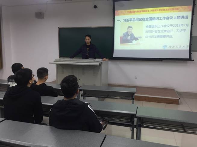 2018年11月14日18:30,硕士18级第九党支部在X9206教室开展“贯彻落实新时代党的组织路线,奋力开创公司党的建设新局面”主题党日活动,本次活动由支部书记陈鹏同志主持。