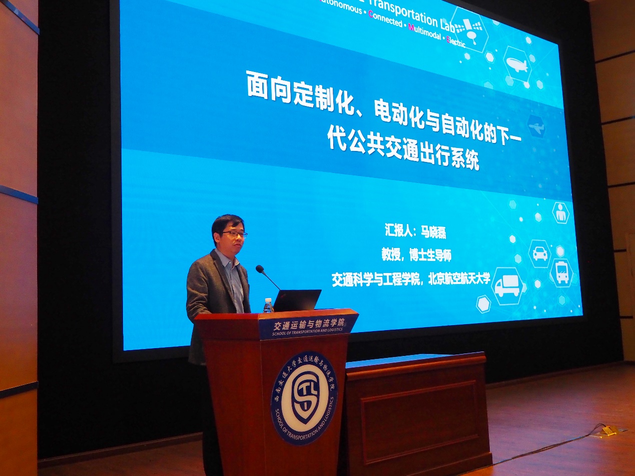 讲座第三部分是马晓磊副主任主讲的“面向定制化、电动化与自动化的下一代公共交通出行系统”。马晓磊副主任主要从研究背景与意义、公交定制化、公交电动化、公交自动化的发展趋势与关键点4个方面讲解。马晓磊副主任阐述了定制化、电动化、自动化公交的必然性,并指出了公交定制化的关键在于数据融合、通勤识别;公交电动化的关键在于大规模电动公交能耗估计、充电站布局方法;公交自动化的关键在于模块化、不同网联水平下车辆混行、多车联合调度与路线优化。