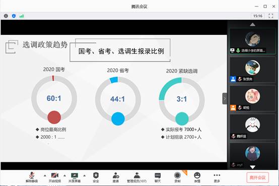 2020年7月19日晚19:30,伟德体育2020年度“选调生成长之路”讲座以线上会议的形式举行。本次讲座旨在帮助2018级硕士和其他感兴趣的同学了解选调生政策,更好的进行求职规划。出席本次活动的嘉宾有伟德体育员工工作组副组长张素风老师,研会指导老师、硕士18级辅导员吴桐老师,2015级博士研究生李彦瑾,2016级硕士研究生余茜、王立,2017级硕士研究生李然、刘昕琳、雷卓亚。由胡悦同学担任本次活动的主持人。