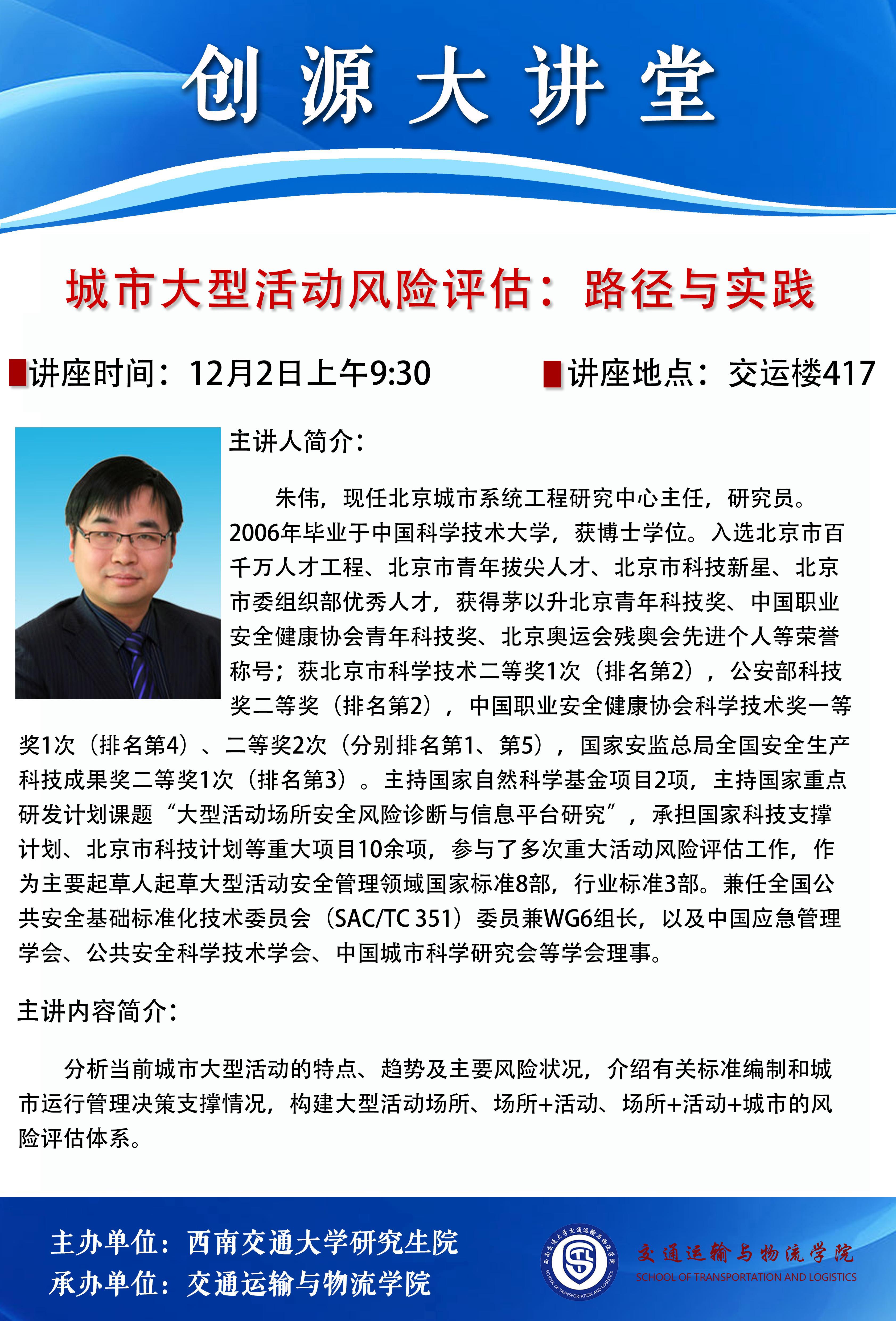 朱伟,现任北京城市系统工程研究中心主任,研究员。2006年毕业于中国科学技术大学,获博士学位。入选北京市百千万人才工程、北京市青年拔尖人才、北京市科技新星、北京市委组织部优秀人才,获得茅以升北京青年科技奖、中国职业安全健康协会青年科技奖、北京奥运会残奥会先进个人等荣誉称号;获北京市科学技术二等奖1次(排名第2),公安部科技奖二等奖(排名第2),中国职业安全健康协会科学技术奖一等奖1次(排名第4)、二等奖2次(分别排名第1、第5),国家安监总局全国安全生产科技成果奖二等奖1次(排名第3)。主持国家自然科学基金项目2项,主持国家重点研发计划课题“大型活动场所安全风险诊断与信息平台研究”,承担国家科技支撑计划、北京市科技计划等重大项目10余项,参与了多次重大活动风险评估工作,作为主要起草人起草大型活动安全管理领域国家标准8部,行业标准3部。兼任全国公共安全基础标准化技术委员会(SAC/TC 351)委员兼WG6组长,以及中国应急管理学会、公共安全科学技术学会、中国城市科学研究会等学会理事。