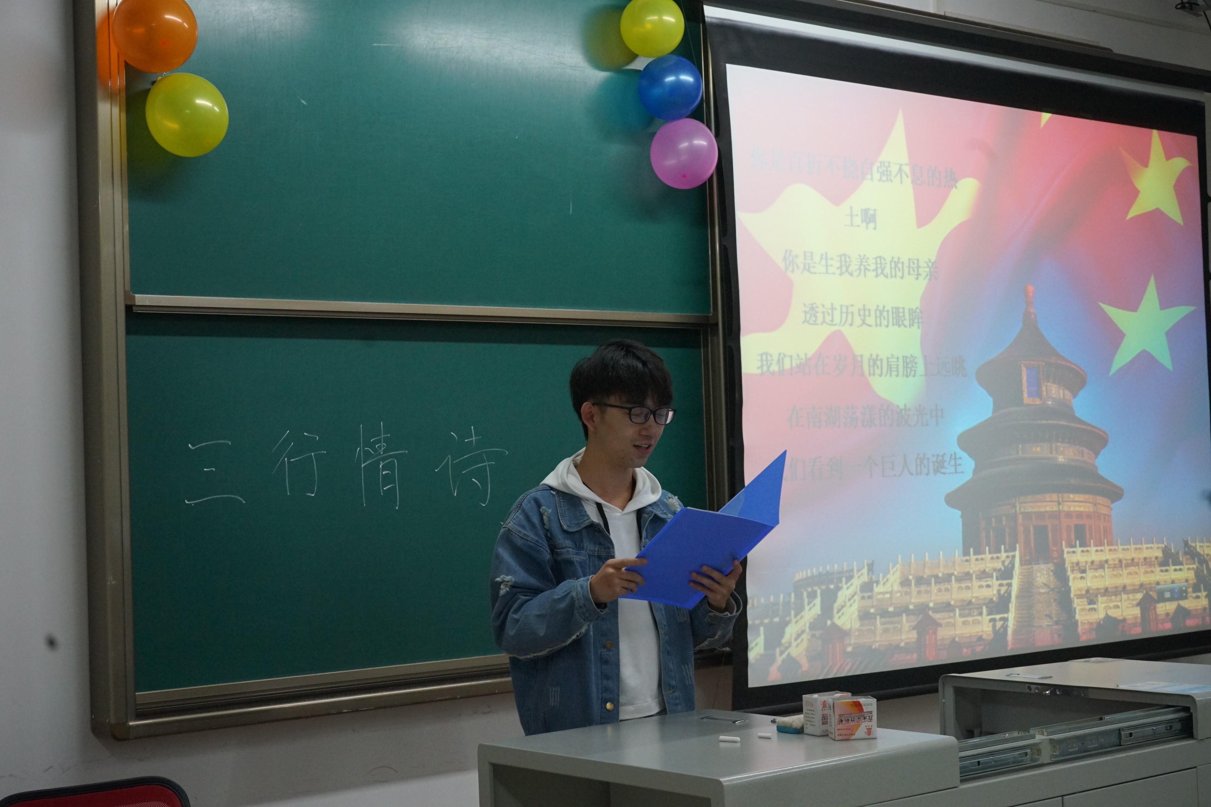 伴着动听的旋律、和着铿锵的节拍,刘洋同学、戴丽同学、邓宇飞同学及孙运豪等同学将经典重现——各自声情并茂地朗诵了《长江之歌》、《爱祖国,更爱家乡》、《长城和运河》等经典爱国诗词。用他们热情饱满的朗诵,倾诉着他们对祖国母亲、对中国共产党的感激与热爱之情。同时,出色的表现也赢得了在场同学及评委的热烈掌声。