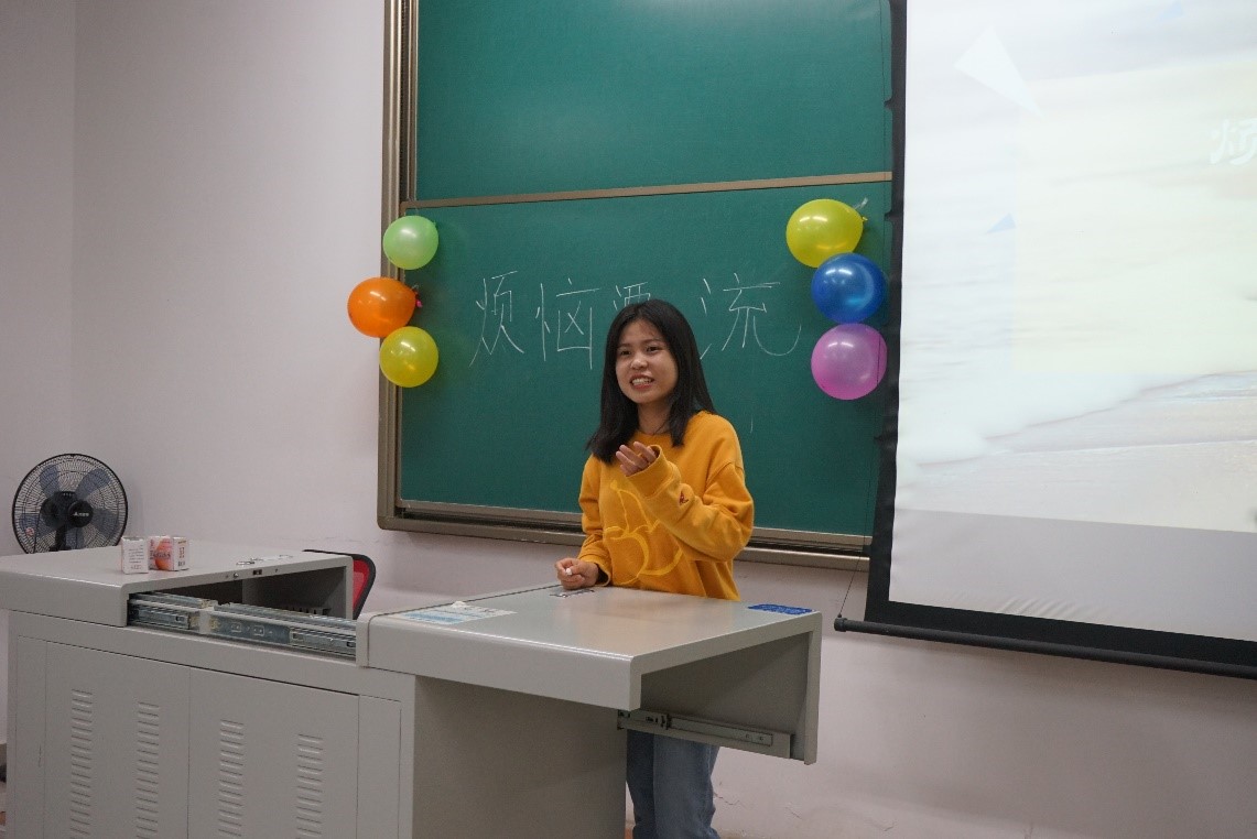此次活动围绕“压力管理”“舒缓压力 健康成长”等主题展开。活动开始之前,心理委员孙运豪同学首先以深入浅出的讲解为大家阐述了压力的定义及压力产生时的反应,并分享到,压力并不可怕,但若是不能正确面对和及时处理,则会对我们的生活造成一定影响。