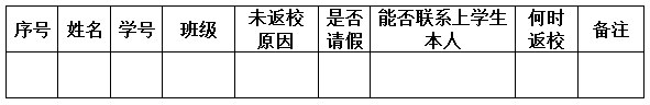 3.请各班班长于9月24日17:00、10月7日17:00前按照附表2格式,将本班同学未返校情况提交至各辅导员邮箱。