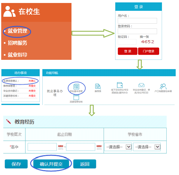 毕业生首页点击“在校生”-“就业管理”通过“用户登录”(用户名为学号,密码为身份证号后六位)进入就业管理界面,点击左侧栏“生源信息确认”,根据说明对相关项内容逐一核对或填写,最后务必点击页面下方确认提交确认本人信息,以完成校核