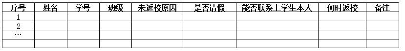 3.请各班班长于4月7日20:00前按照附表2格式,将同学未返校情况提交至各辅导员邮箱。