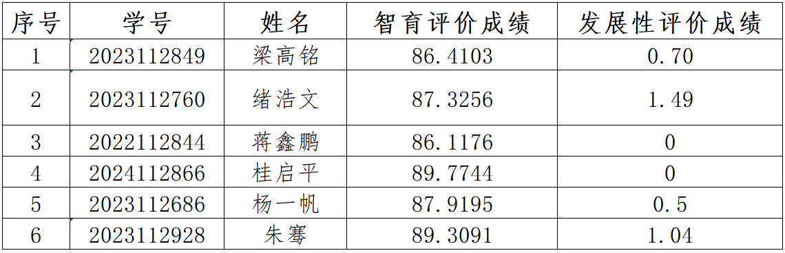 根据员工课程成绩变更及加分录入异议、公司教务部门及公司综测加分小组审核,现将以下6名同学2024-2025学年智育和发展性评价成绩重新予以公示。特此说明!