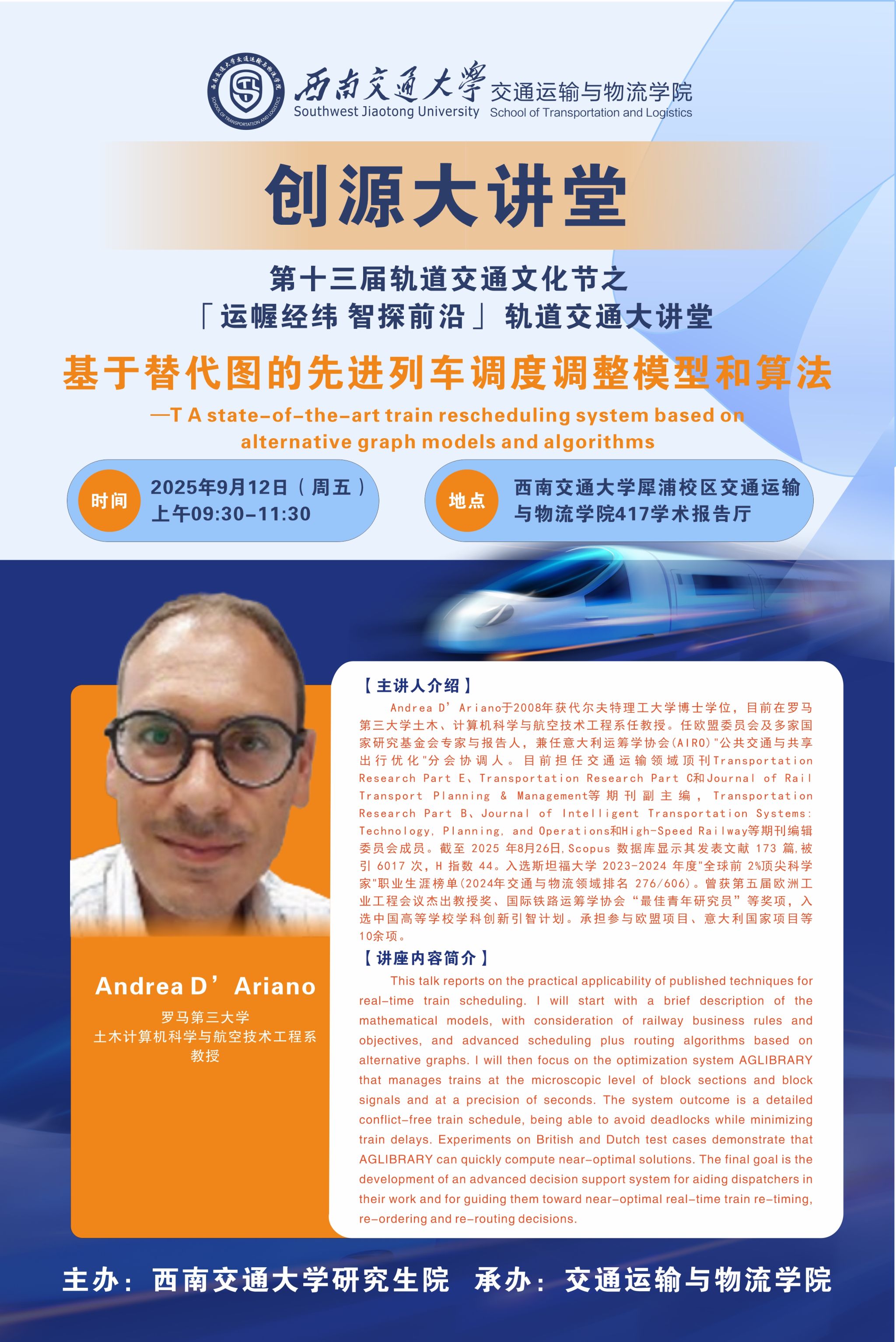 Andrea D’Ariano于2008年获代尔夫特理工大学博士学位,目前在罗马第三大学土木、计算机科学与航空技术工程系任教授。任欧盟委员会及多家国家研究基金会专家与报告人,兼任意大利运筹学协会(AIRO)"公共交通与共享出行优化"分会协调人。目前担任交通运输领域顶刊Transportation Research Part E、Transportation Research Part C和Journal of Rail Transport Planning & Management等期刊副主编,Transportation Research Part B、Journal of Intelligent Transportation Systems: Technology, Planning, and Operations和High-Speed Railway等期刊编辑委员会成员。截至 2025 年8月26日,Scopus 数据库显示其发表文献 173 篇,被引 6017 次,H 指数 44。入选斯坦福大学 2023-2024 年度"全球前 2%顶尖科学家"职业生涯榜单(2024年交通与物流领域排名 276/606)。曾获第五届欧洲工业工程会议杰出教授奖、国际铁路运筹学协会“最佳青年研究员”等奖项,入选中国高等公司学科创新引智计划。承担参与欧盟项目、意大利国家项目等10余项。