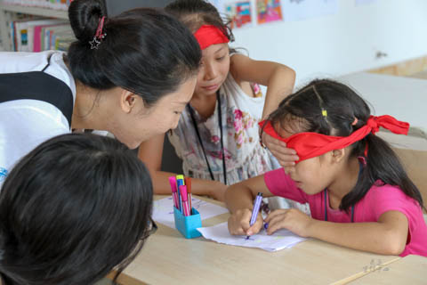 镜头来到心理健康辅导课,实践队员正让孩子们用红领巾蒙住双眼,感受“黑暗”。初次体验“盲人”视角的小朋友们显得有些兴奋,接下来的任务,在纸上写下自己的名字并随心画画。