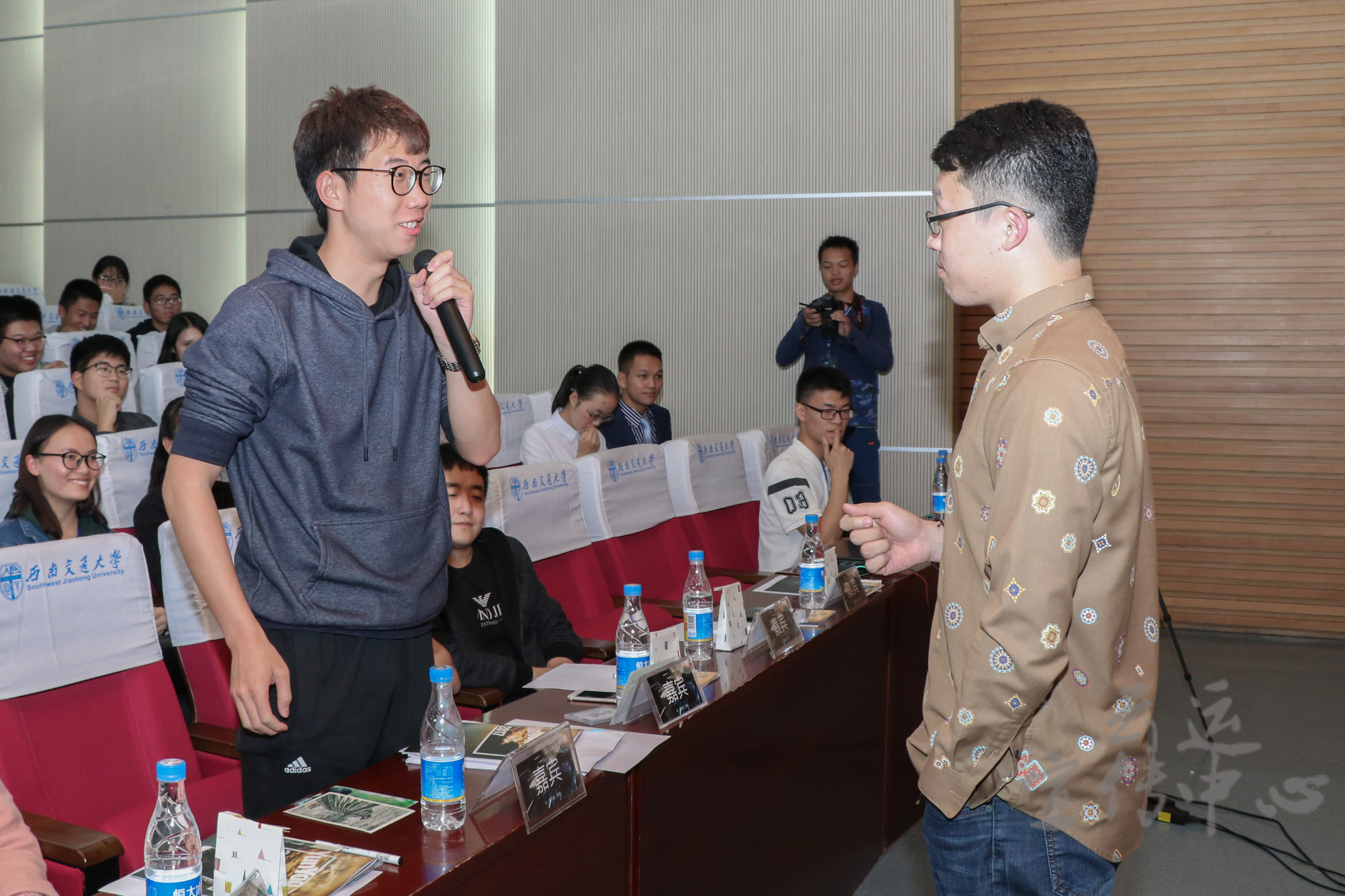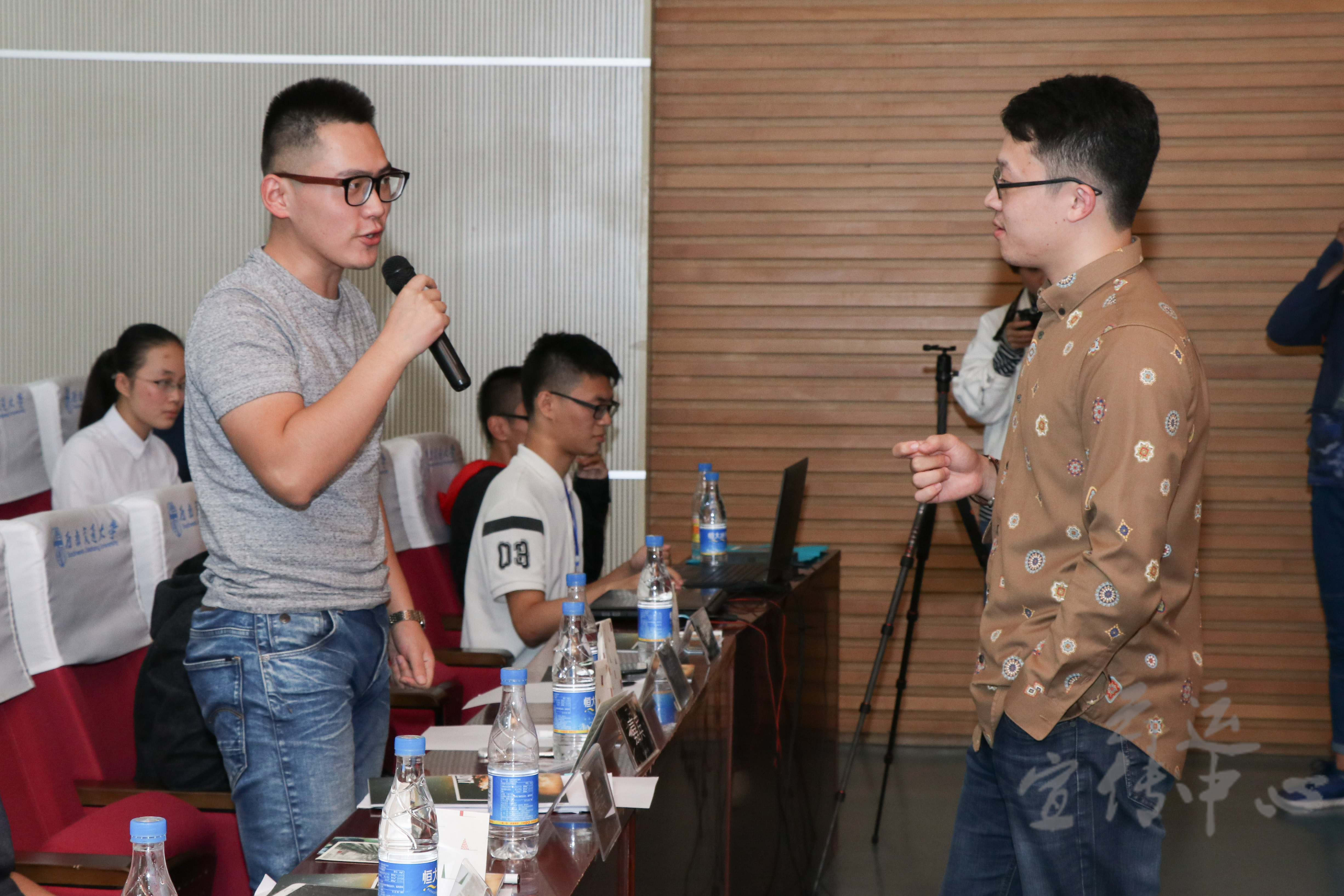 随后,交互设计师、复旦大学青年智库讲师计育韬老师,凭借其资深经验从专业技术方面为大家解读了新媒体运营与HTML5设计中的细节问题,分享了其在推广公众号、运用创新理念以及吸引长期稳定关注量的秘诀,并且与现场嘉宾和同学们进行了问答、互动,同学们饶有兴趣,现场气氛活跃。紧接着,前插坐公司总编辑梁逸帆老师以幽默风趣的语言,站在老员工的视角讲解了七个大家最关心的新媒体与就业方面的问题,不仅解答了高年级的同学们面临的就业疑惑,同时也为低年级同学们对未来的职业规划、发展方向提供了建议。