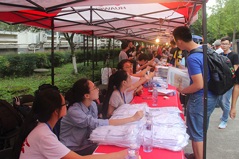 天色渐晚,新生报到的热潮,仿佛已经如上午那场秋雨一样退去,偶尔会有姗姗来迟的新生,脸上带着初进大学的兴奋,在公司的迎新点下办理一道道手续。迎新工作并没有因为新生的减少而有一丝懈怠。整理材料,核对信息,对每一位新生都尽职尽责。"在这边领衣服之后,就可以去宿舍了。"这样的嘱托相信工作的同学们已经重复了无数遍,却还是温暖而清晰。