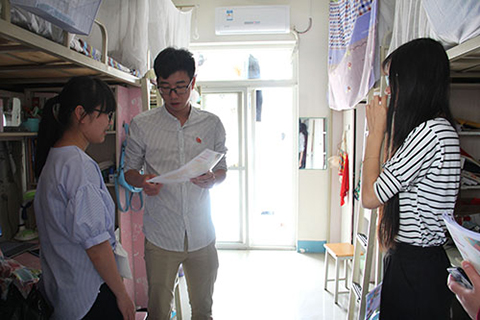 随后,李林卿老师和园区工作人员一起到伟德体育各员工宿舍发放防灾安全宣传册,宣传册中简要介绍了火灾成因、如何预防寝室火灾、室内室外地震避险的方法。宣传过程中,李林卿老师警示同学们要注意消防安全、地震避险,要树立安全防范意识,并再次强调禁止使用违章电器,以免种下安全隐患。同学们都表现出了积极认真的态度。