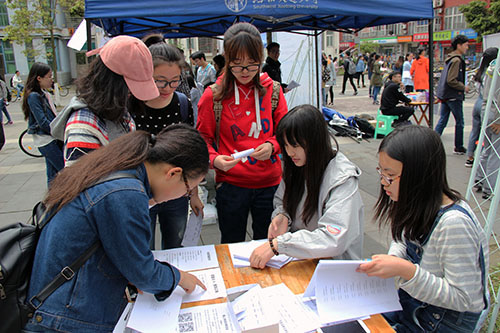 早上10:00,天朗气清,活动正式开始,同学们热情饱满,参与度极高。中午12:00,活动到达高潮,现场人声鼎沸,同学们穿梭在几个答题点间,热闹非凡。一些同学拿着积分兑换自己的奖品,沉浸在一派欢乐的氛围中。