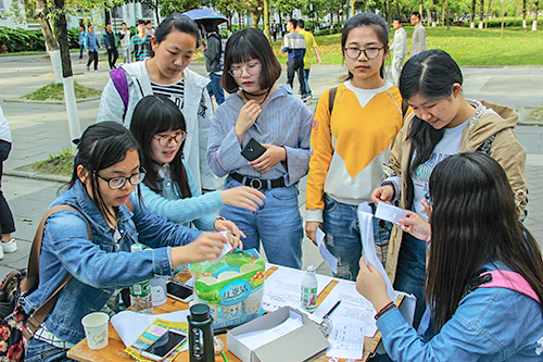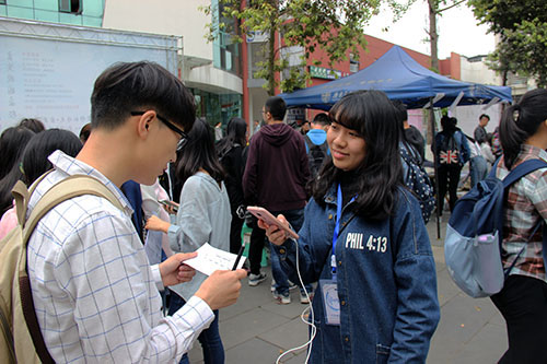 二食堂门口分布了五个答题点,依次对应五种题型——“飞花令”要求参赛者在一分钟内说出规定带某个字的诗句;“余音绕梁”要求参赛者抽取诗词并选择难度分别为中、高、低的朗读方式朗读所抽诗句;“阴晴圆缺”即诗词填空或对句题;“慧眼识珠”是在打乱并混有干扰的字中挑选出正确字词组成原诗句;而“对答如流”是关于文学常识的客观问答题。五种题型以不同的形式考察了参赛者的诗词水平,每个答题点最高可积三分,最后参赛者顾客可根据积分兑换不同的奖品。