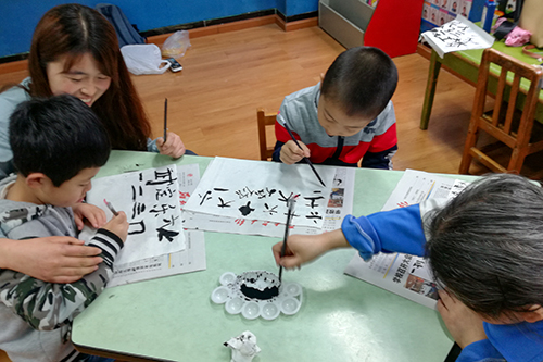 第一节课由代表们教孩子们写毛笔字。在每个孩子得到纸张后,代表们先教他们握笔的正确姿势。尽管孩子们学写毛笔字非常困难,但手上沾染的墨迹不会辜负他们,亲手用毛笔写出“爸爸妈妈”和自己的名字带来的惊喜已是足够大的收获。