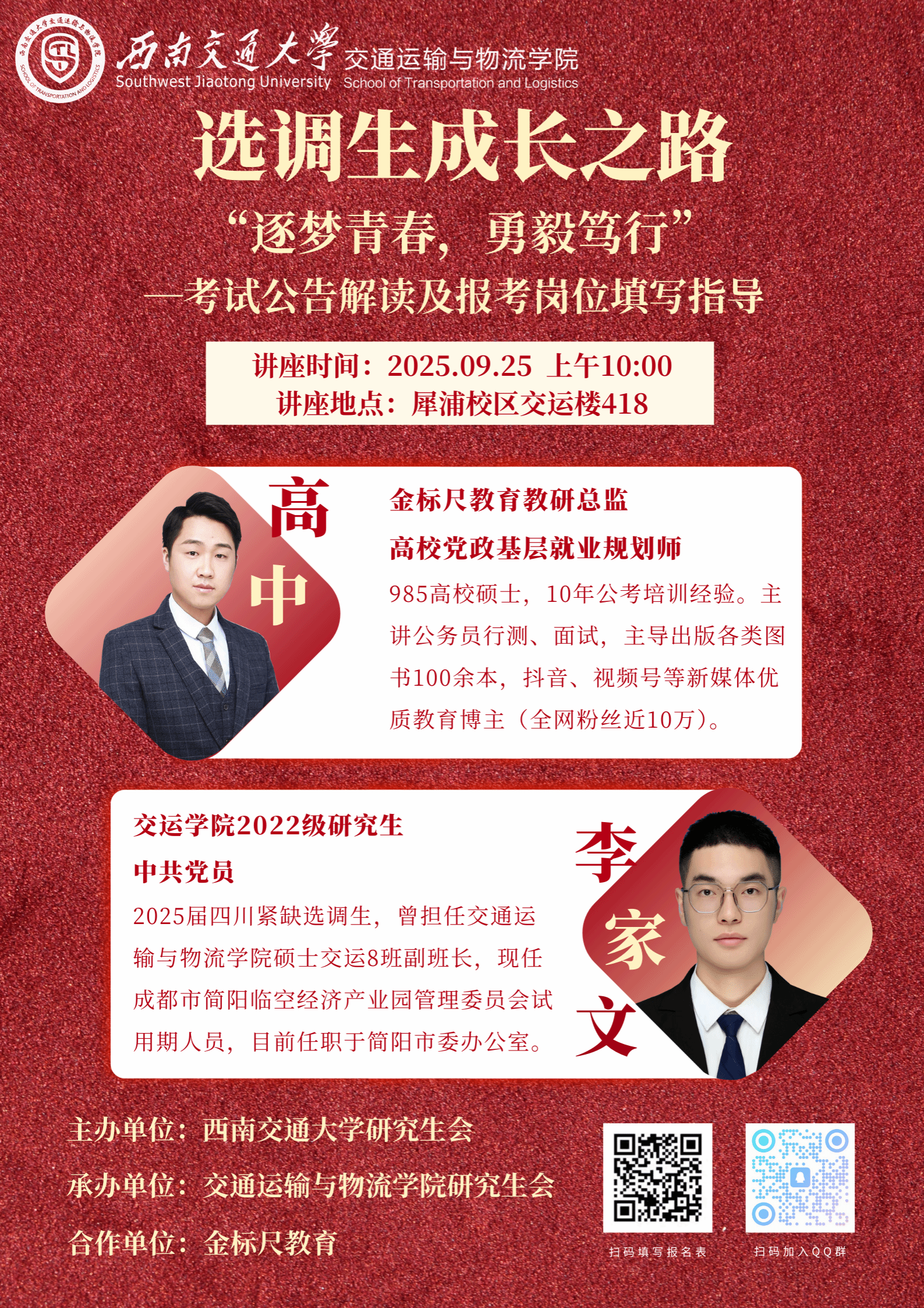 为贯彻党的二十大报告中就业优先战略,推动2026届毕业生实现高质量充分就业与个人价值,公司特别举办“逐梦青春 勇毅笃行”——考试公告解读及报考岗位填写指导活动。本次活动旨在通过政策解读、岗位分析等专业指导,帮助2026届毕业生明晰备考方向、找准岗位定位,为投身四川紧缺选调生岗位、助力地方发展、明确“扎根基层、服务祖国”的就业方向夯实基础。本次活动将邀请金标尺教育名师和公司选调生院友分享备考经验与心得感悟,为毕业生提供参考和帮助。