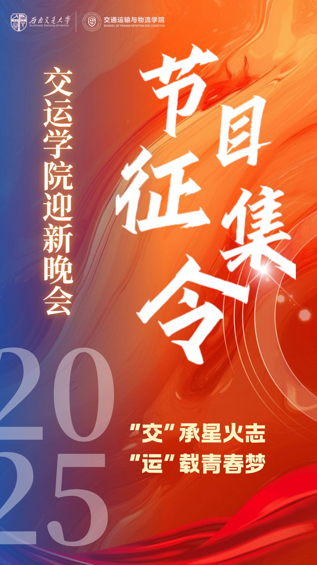 星河滚烫,新程启航。为欢迎2025级新交运人的到来,凝聚全体交运人的奋进力量,激励大家坚守初心、勇毅前行,我们特此发出2025年迎新晚会节目征集令,诚邀每一位心怀热爱的你,共筑这场青春盛宴!