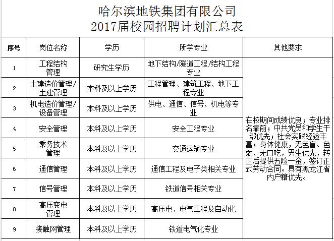 近期,公司已陆续启动实施地铁1号线三期、2号线一期和3号线二、三期等工程项目建设,规划中三条线总长度约90公里,轨道交通工程将处于建管同步推进阶段。现面向公司2017届本硕优秀毕业生,公开招聘电气类、机电类、土木类、建筑类、通信类等专业人员参与哈地铁新线工程建设工作,具体招聘条件见下表。