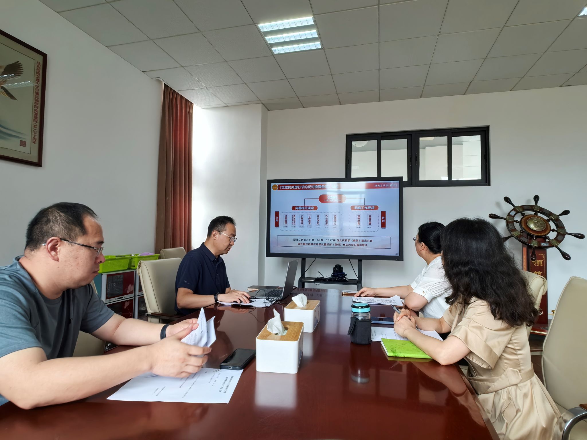 随后,刘继宗领学了《党政机关厉行节约反对浪费条例》,重点对经费管理、国内差旅、公务接待、公务用车、会议活动、办公用房、资源节约等关键章节进行了详细解读,并结合公司纪检监察日常工作实际,就如何在工作中落实厉行节约、反对浪费进行了深入探讨。